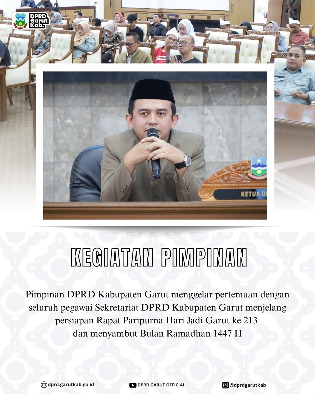 Garut - Pimpinan DPRD Kabupaten Garut menerima audiensi dari Paguyuban Indrialugina Kecamatan Cisurupan Kabupaten Garut terkait Penyampaian usulan Penataan Kecamatan Cisurupan, Senin (08/12/2025).